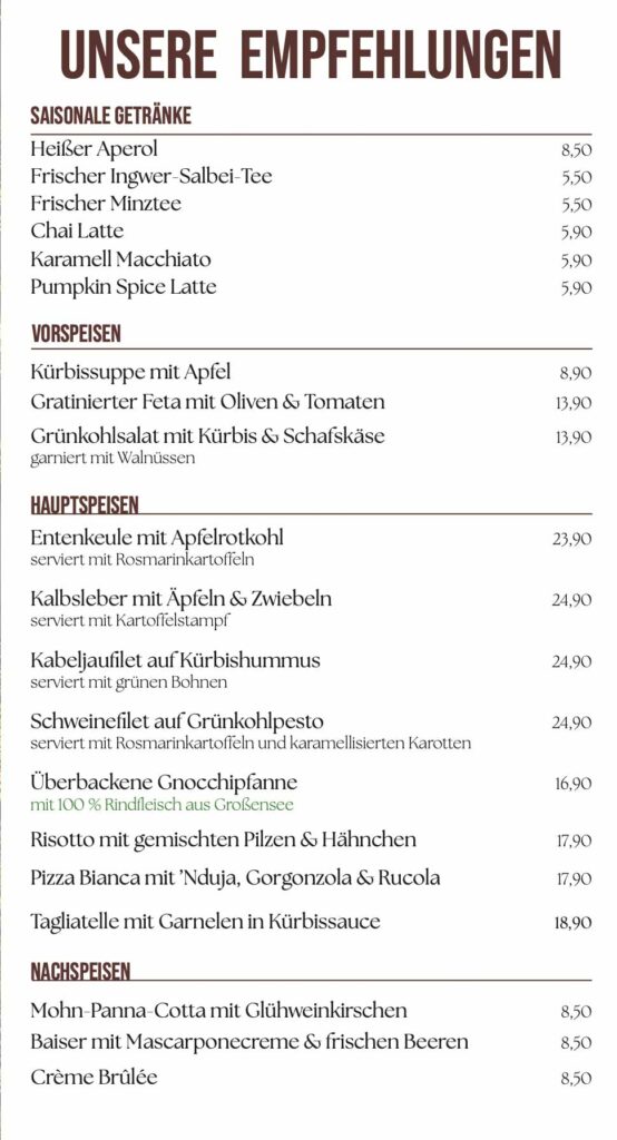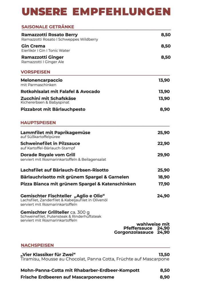 Die Speisekarte präsentiert eine Auswahl an liebevoll zubereiteten Gerichten, die mit frischen Zutaten höchster Qualität komponiert wurden. Jeder Bissen erzählt die Geschichte sorgfältiger Handwerkskunst und leidenschaftlicher Hingabe zu kulinarischem Genuss. Von delikaten Vorspeisen über herzhafte Hauptgerichte bis hin zu verführerischen Desserts spiegelt die Karte die Liebe zum Detail und den frischen Geschmack der ausgewählten Zutaten wider.